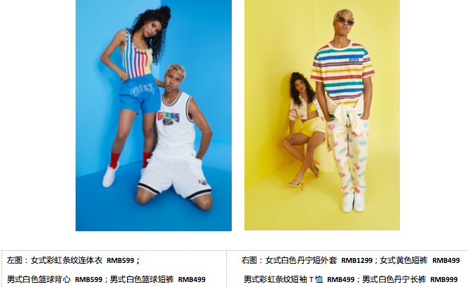 围绕“色彩”的主题展开,J BALVIN将五大色调注入了Colores系列,热情的红色、活泼的黄色、亮眼的绿色、清爽的蓝色、神秘的紫色,突破条框的抢眼配色结合在一起,于绚烂又热情的氛围中打造全新的概念潮流,传递着J BALVIN和GUESS眼中的拉丁文化,轻易就将欢乐感染人心。该系列女装涵盖各式短款连帽运动衫和上衣、凸显身材的紧身衣、慢跑裤、运动衫两件套、以及丹宁短外套和短裤套装,突出女性的活力与性感。同系列男装T恤、运动衫和慢跑裤也大量采用扎染、条纹和色块印花,与该系列女款风格一致。男款系列主打哥伦比亚和棱镜两种风格的印花,有纽扣衬衫、尼龙短裤和连帽夹克等相关单品可供选择,高调张扬的风格为男式造型增添亮点。
