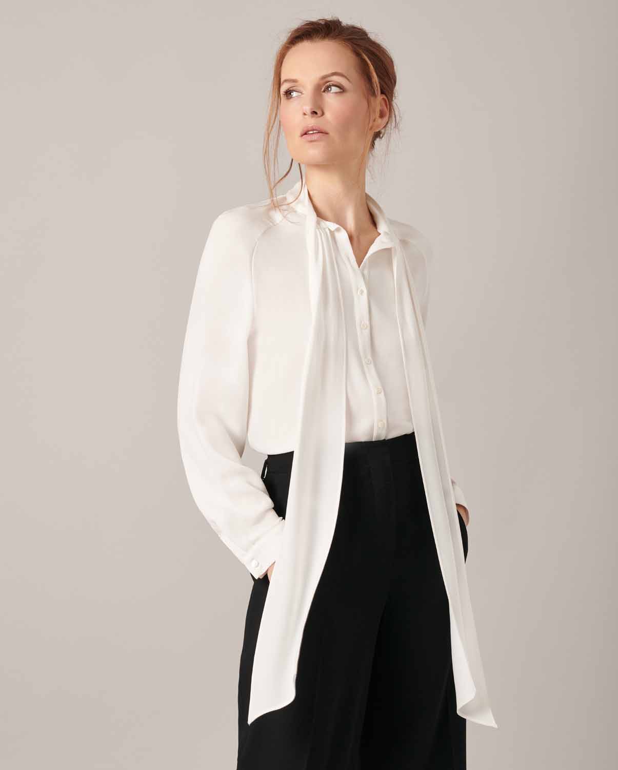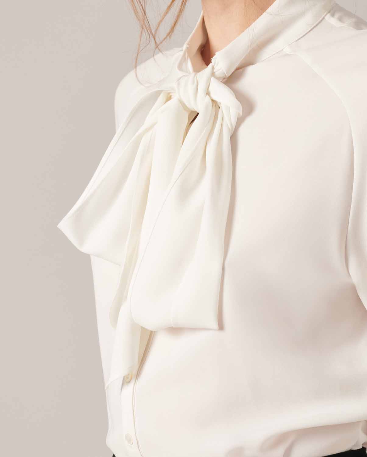Santana白衬衫是由轻盈的绉纱面料制成,垂坠的随性中透露着若隐若现的性感。Anne Fontaine巧妙的运用了肩袖一体的设计,赋予了白衬衫宽松自如的穿着体验,并在领口加上了同样材质的飘带。任其垂下散落在前襟处,飘逸而洒脱,系于领口处为蝴蝶结,优雅而别致,尽显属于女性的典雅知性之魅。