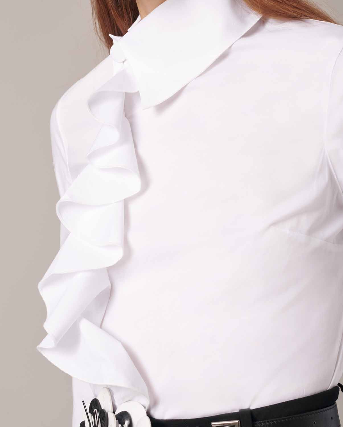 Eglantine白衬衫巧妙地将正前胸的一排扣子和领口移动到了脖子的右侧,并相应进行了立体褶皱的设计,给予了白衬衫多一层维度的柔情和雅致。袖口的单层大花边设计让举手之间展露如花瓣般垂落的双袖,尽显温柔的法式风情。