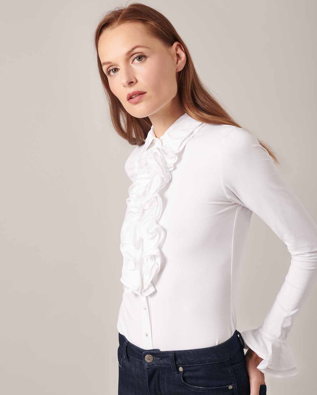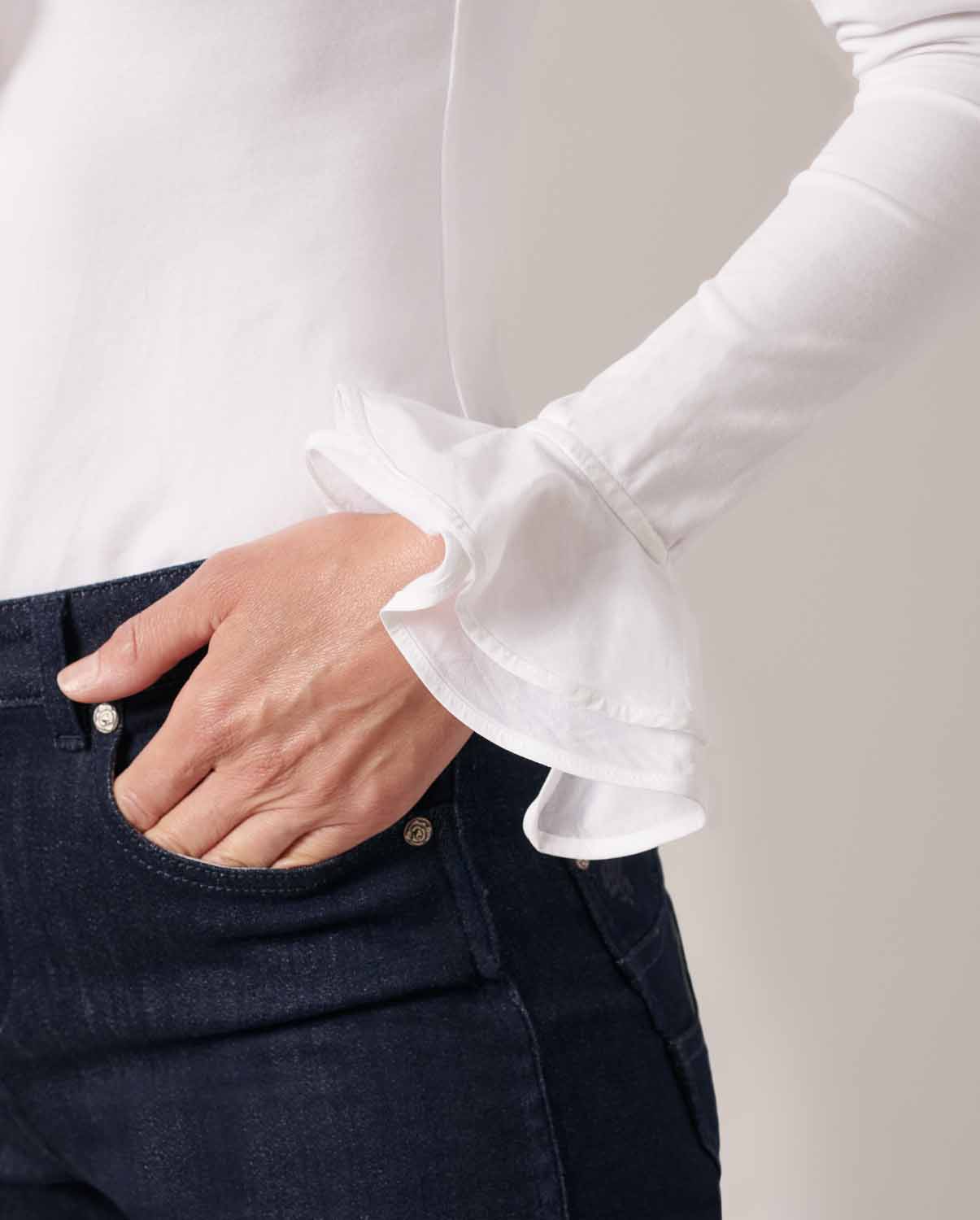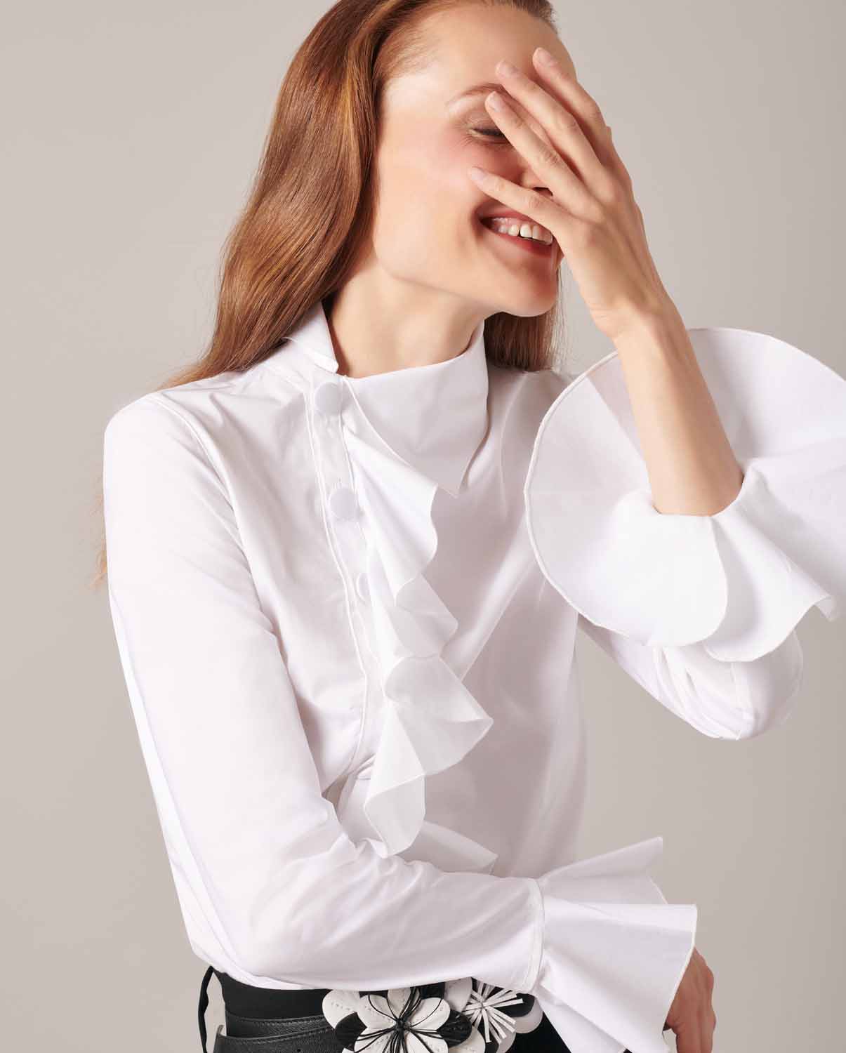 Patsy白衬衫同样是由舒适的皮马棉制成,胸前和领口皆是双层褶边的设计,时髦立体的轮廓被灵动的剪裁贯穿其中。双层叠进的袖口略带薄纱,轻轻抬起便犹如花朵般绽放,极力诠释着当代女性精致而有仪式感的生活态度,同时通过设计和细节的巧思彰显前卫的时尚主张。
