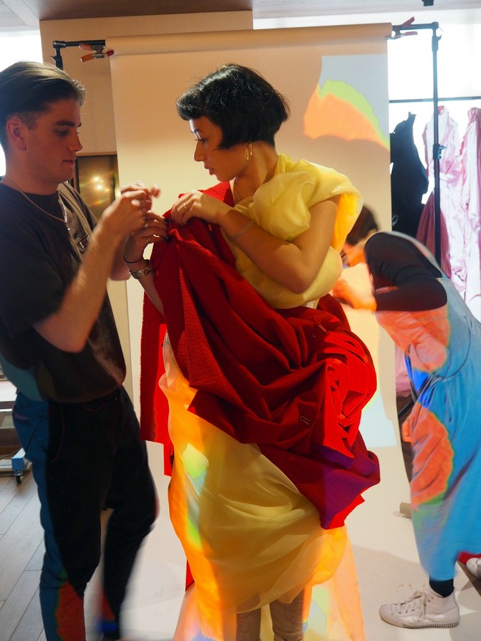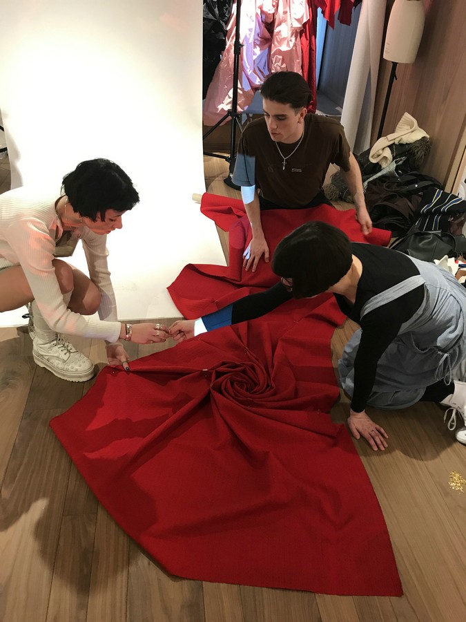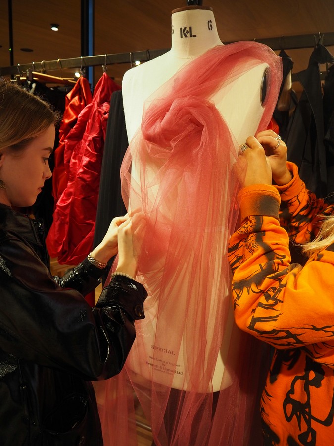 【2020年3月4日】Alexander McQueen老邦德街旗舰店的二楼教育空间内开设的关于垂坠工艺的多媒体培训班,为使用捐赠面料的曼彻斯特艺术基金会学院的学生们授课。