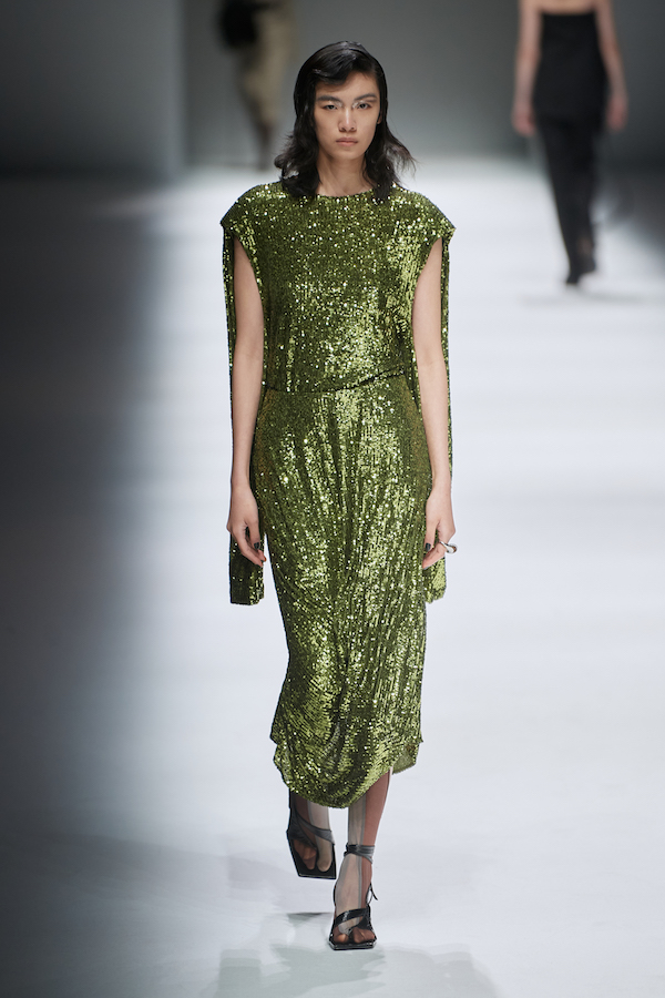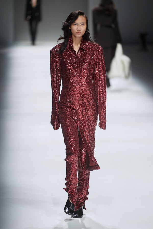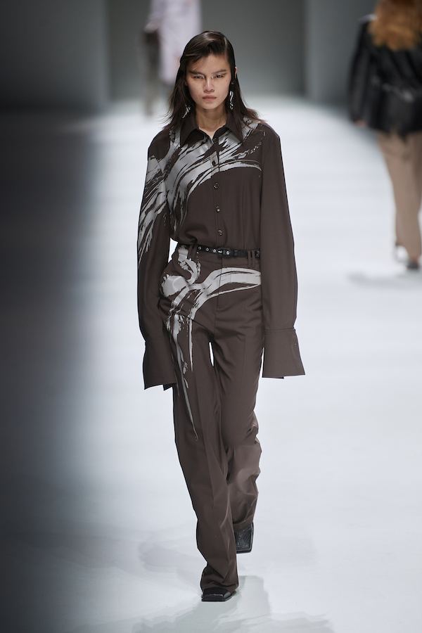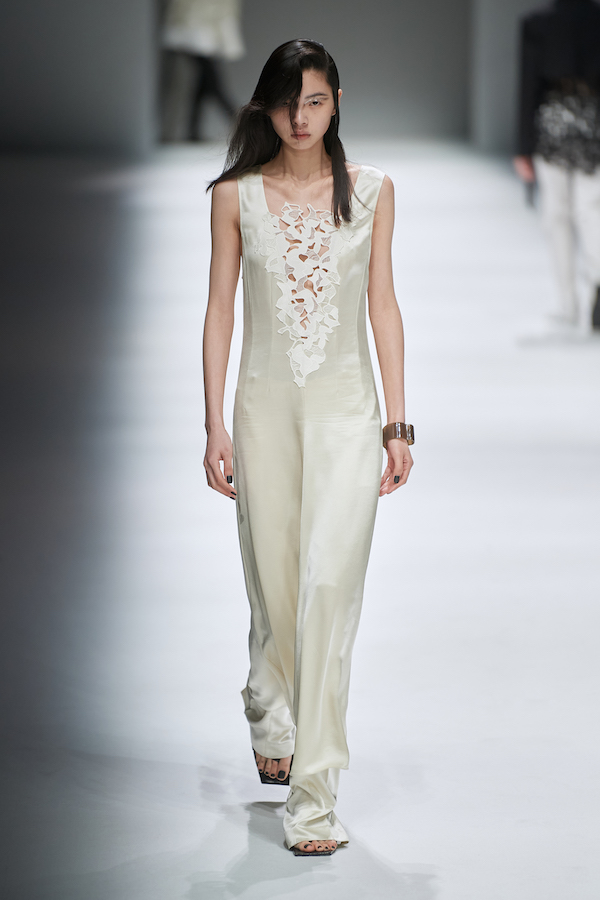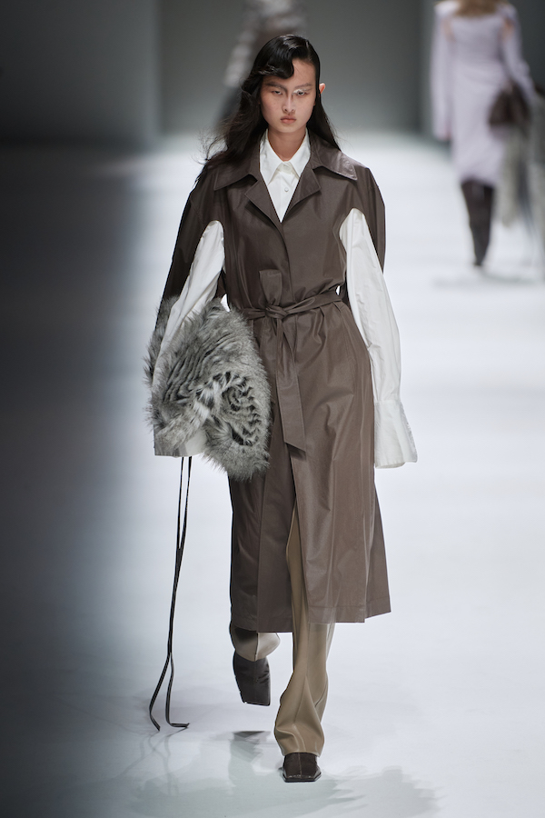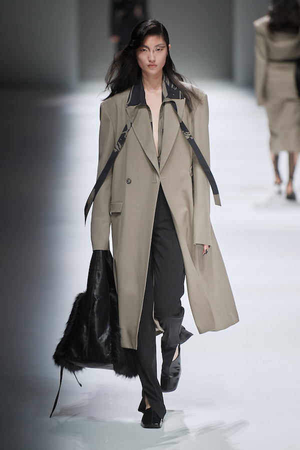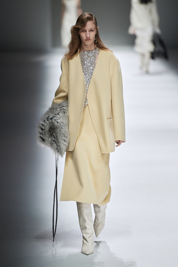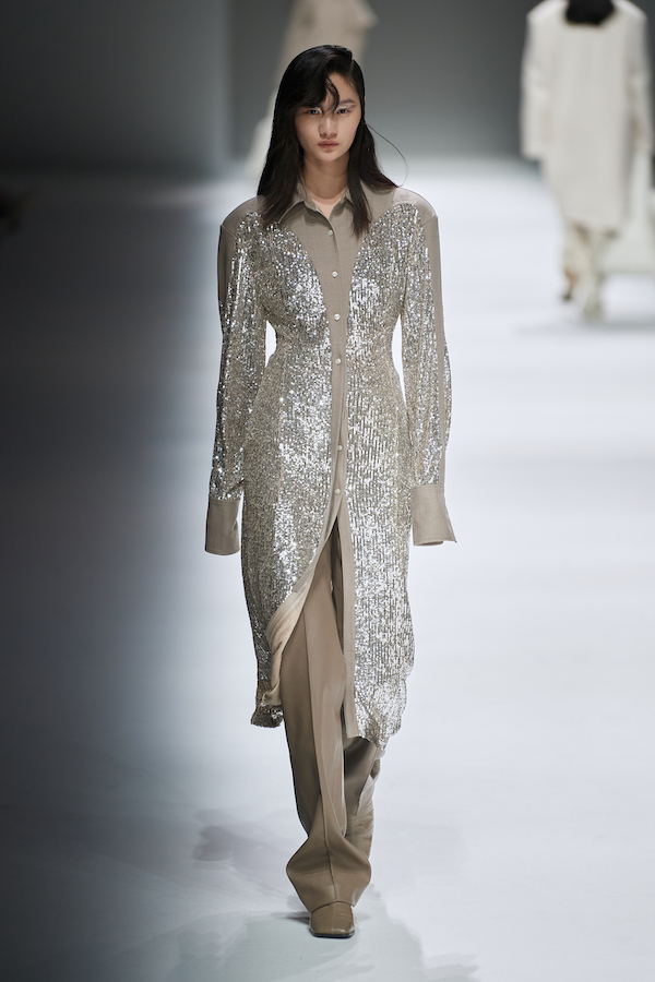 本季在色彩方面依旧延续了品牌低饱和度的用色风格,运用灯草灰搭配清浅的灰蓝色,丁香紫碰撞深摩卡棕,调和出奇妙的化学反应。水溶刺绣、珠片等品牌经典元素也有全新运用演绎。