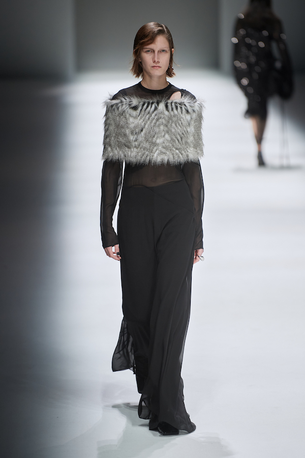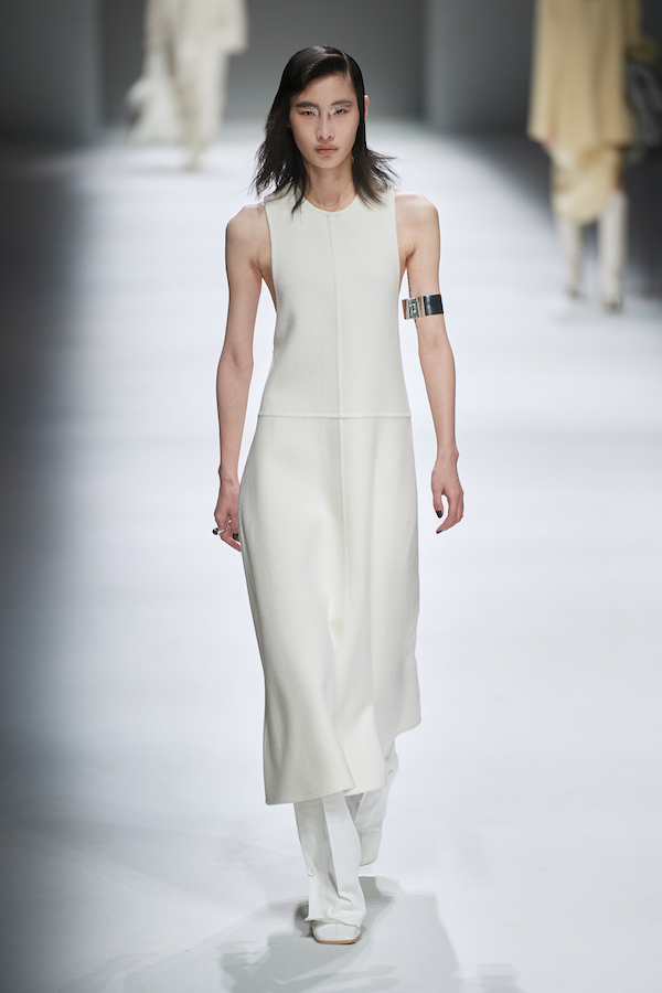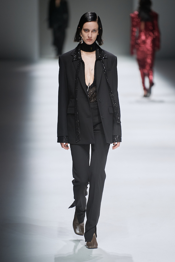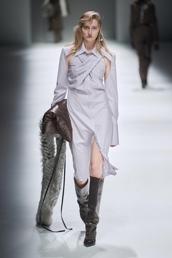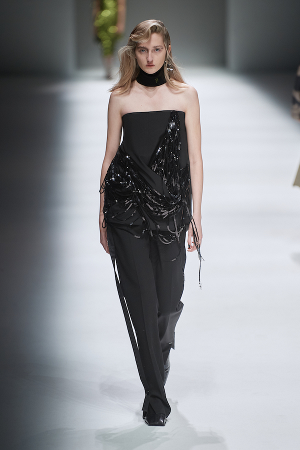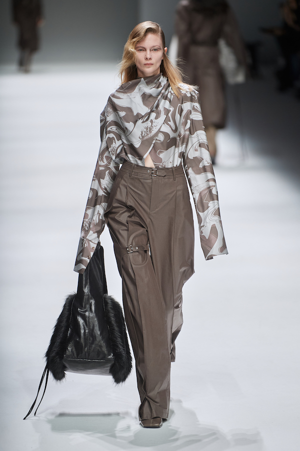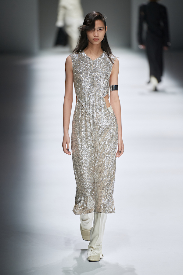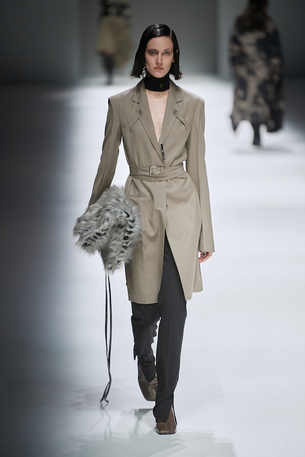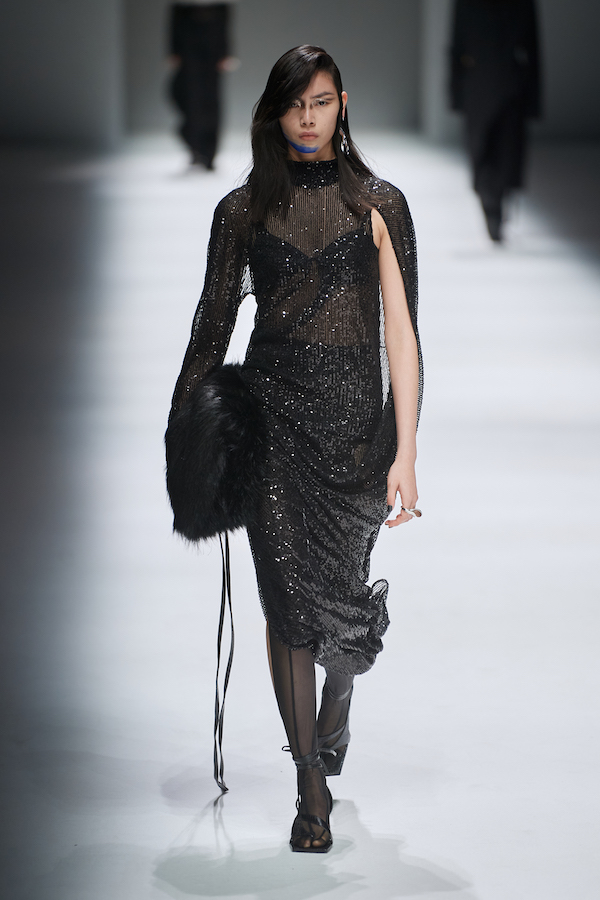 本季在色彩方面依旧延续了品牌低饱和度的用色风格,运用灯草灰搭配清浅的灰蓝色,丁香紫碰撞深摩卡棕,调和出奇妙的化学反应。水溶刺绣、珠片等品牌经典元素也有全新运用演绎。