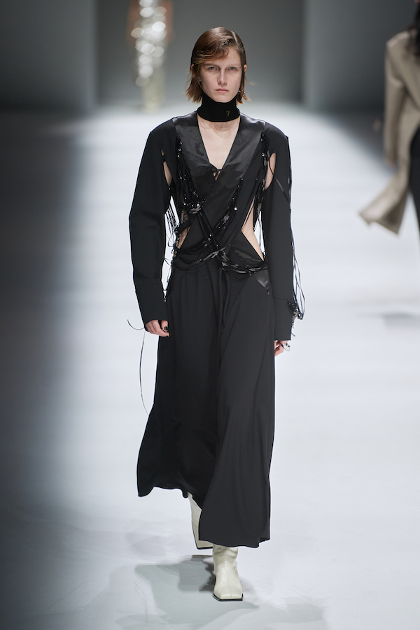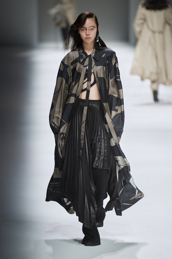 YOEYYOU 2021秋冬系列以超现实的浪漫主义去分解建构美的多样性,走进这片迷离怪诞,穿透时装的空间,描述这些变化与组合。以具有建筑感的轮廓为架构植入灵活、迂回的流畅线条,运用大量穿插交叠以及扭转的解构手法,形成巧妙的镂空结构,以简洁的轮廓包容多变的细节。贯穿于整个系列的无序曲线印花和飘带元素,调和柔软与硬朗的边界,将对立、流动的曲线比作女性摇曳的灵光,折射在自由的外立面上,诠释天真、锐利的女性特质。