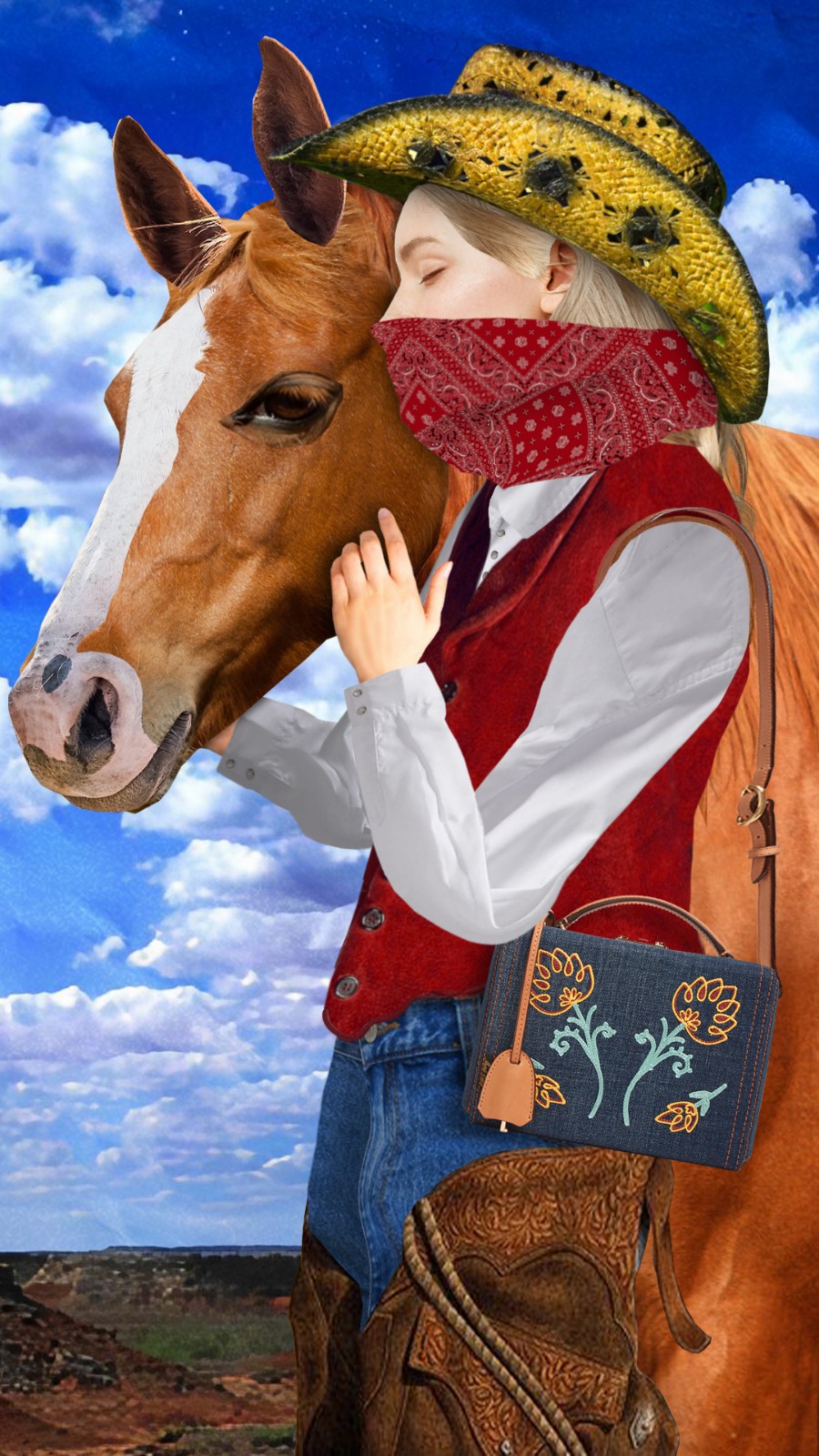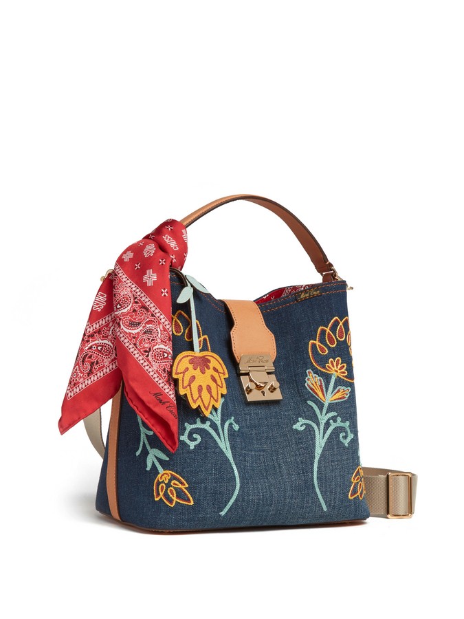 如果没有牛仔——这个美国对时尚界的最大影响元素,美洲风格就会显得不完整。牛仔布既实用又时尚,被用在该系列的主要手袋上。传统的西方花卉刺绣和 Tommi Parzinger 设计的马匹标志,被缝合于面料上。海军蓝和金色的 Mark Cross 标识是常见后袋牛仔裤标签的象征,镶有品牌logo以及双缝线的手提包,让人联想到经典的牛仔裤。手袋还饰有植鞣革饰边,类似于牛仔裤背面或马鞍上的贴片。