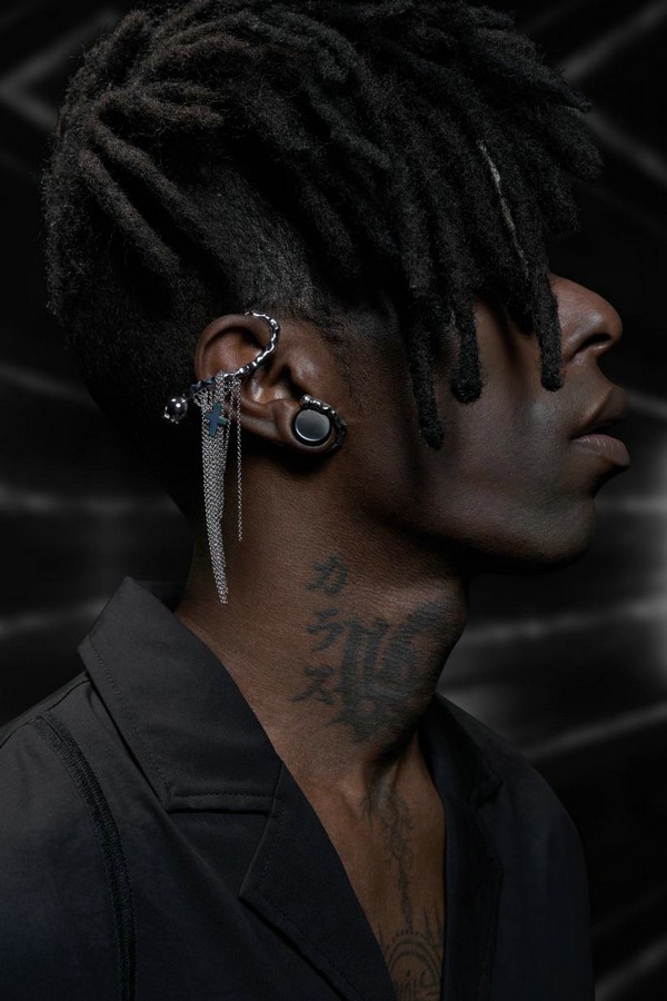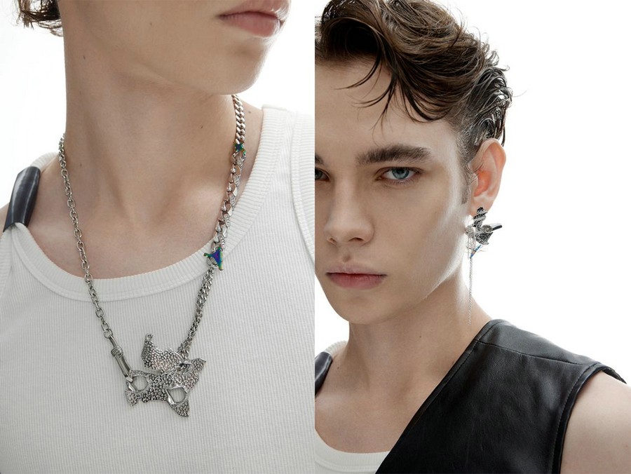 本系列产品主要突出工业街区文化,遍布的弹孔、破碎干瘪的易拉罐碎片、泛光的铁链— —无一不是青年野心的真实记录。幻彩色电镀装饰柔化冲突与破碎感,意味找到自我表达的新方式,比如街舞、比如时尚。