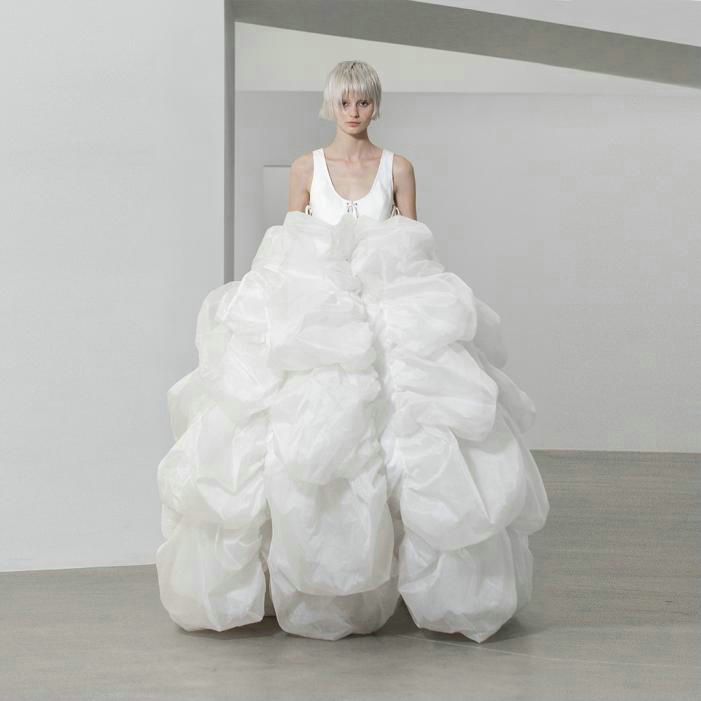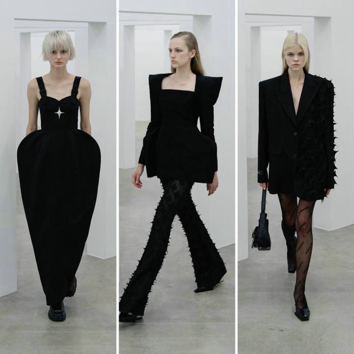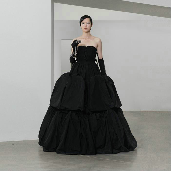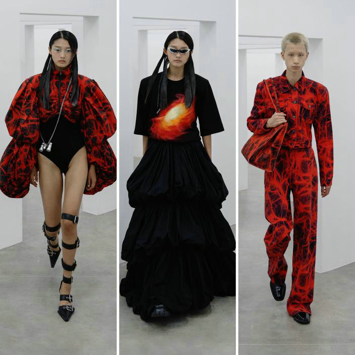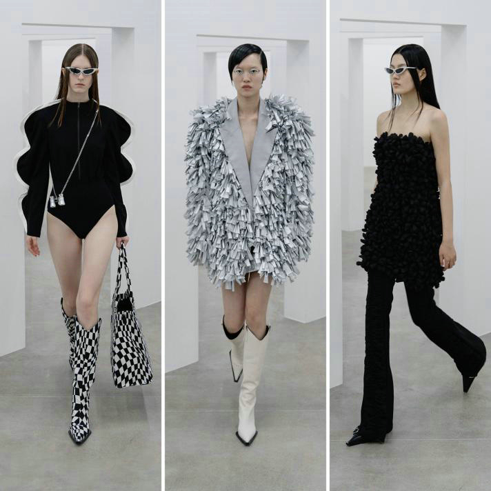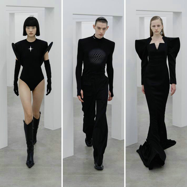 本季度延续了ANNAKIKI标志性的3D立体剪裁未来科技感廓形,艺术几何3D线条的袖子,以及对科技材质的尝试和面料的二次改造。通过对金属质感的光缎面料、金属五金配件的运用,构造出一个科技感十足的视感体验。发光材料、光纤织造等高科技材质的加入,在为感官赋予更深层次的精神内核,亦是一种对未来感的独到尝试。同时,光与影的运用,亮与暗的对比,无疑呼应了“类星体是宇宙中最明亮的光源之一”的特质。