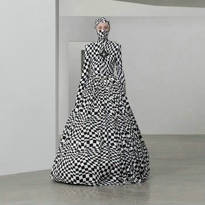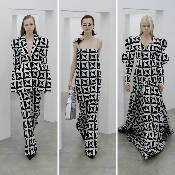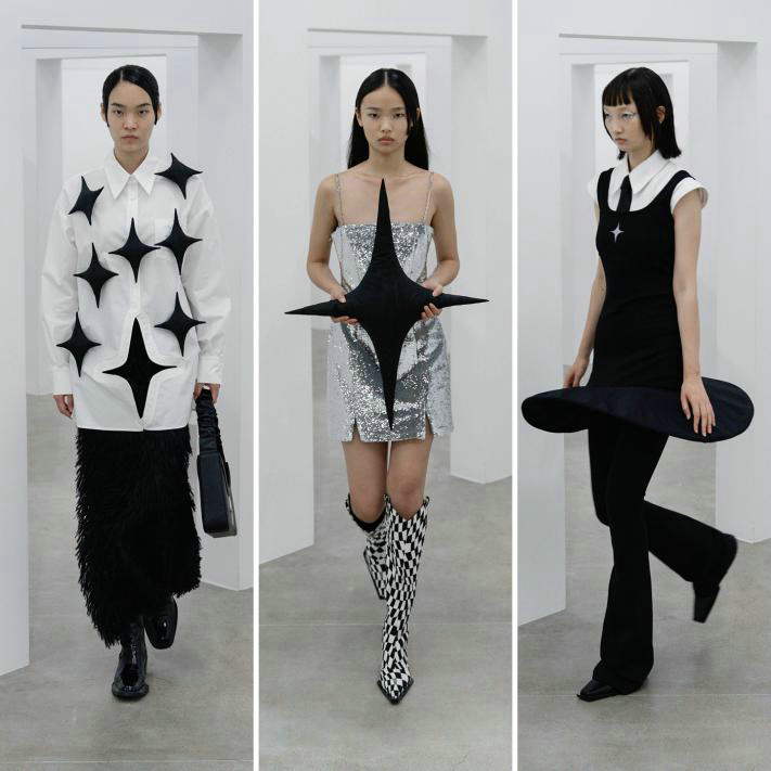 为了进一步打造科幻之感,本季在印花上进行了开发与创新,如科技X光、星光倒影、星际电光,都促成更为真切的视觉表达,象征着宇宙中复杂交错的力量。其中重点的3D变形几何印花和一体两面流星印花,都在视觉上形成“陷阱”,无论是错落有致还是不规则扭曲的黑白格纹,都令人想起物理学概念中的“时空的涟漪”。液态金属质感印花、3D金属流星、星球图案的点缀,无疑再次强调了宇宙与科幻,也悄然将这一宏大的主题具像化。反复出现的十字星形,直白地强调了系列所探讨的主题,该意向的累加运用,也无形中成为“线索”,将各色时装串联而起。
