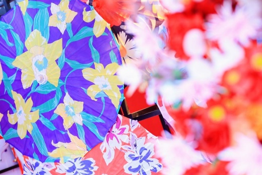 整体万圣花坊的空间以红色作为主色调,搭配日式神秘的暖色纸灯笼,空间两侧与顶部则陈列以SLY花纹制成的和伞,与正中艳丽夺目的花墙相呼应,犹如置身绚丽花田,沉浸在SLY精心打造的花坊中。