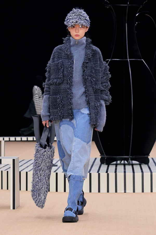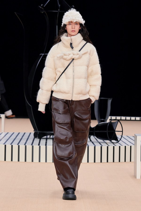 删繁就简的东方元素一如既往贯彻在夹生:HALF MADE的设计血脉中,在这次秀场上,我们不仅可以看到手工结扣这一经典元素,还有对于传统酒器的再重塑,酒瓶和酒囊作为道具和图案反复出现,极具设计趣味性和张力。