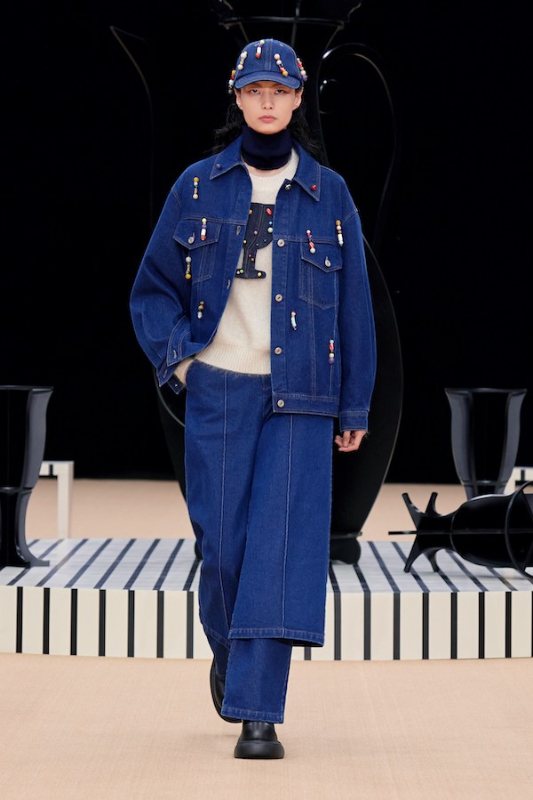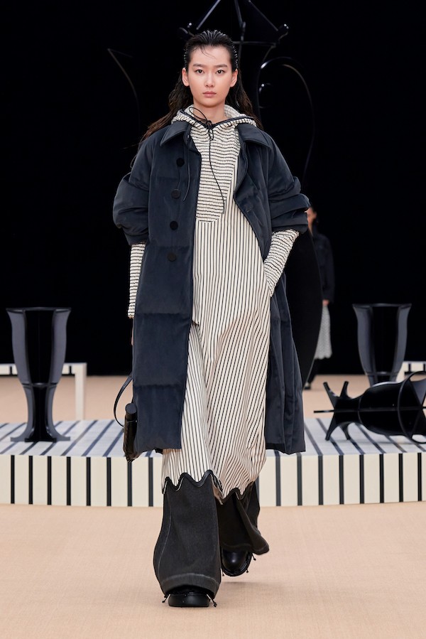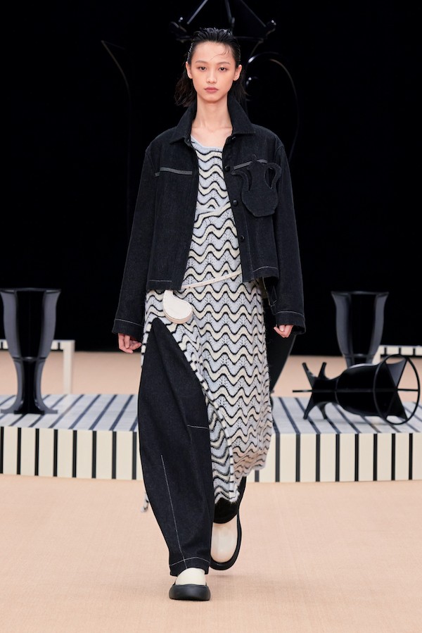 秀场的舞台设计也延续了2023春夏系列的经典黑白色调,外圈的圆环像是一圈座椅,而中间的圆盘上放置着酒瓶和或倒或立的酒杯,让人仿佛沉浸到一场喝至尽兴的友人酒局氛围中。