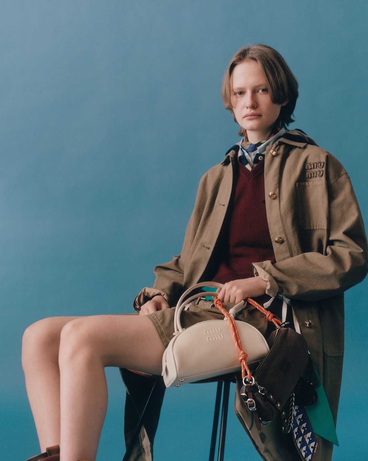 成衣系列以全新视角重释Miu Miu经典单品,开启崭新篇章。缀饰徽标的棉质帆布拉链夹克、短裤、长裤与蓬蓬迷你半身裙低垂于腰际,呈现卡其与胭脂红色调;淡彩围裙式连衣裙外搭于条纹橄榄球衫与Polo衫,或内衬于深军绿色涂蜡质感夹克。制服色系及红色短裁针织衫与棉质府绸衬衫藉由精妙比例演绎温暖质感。