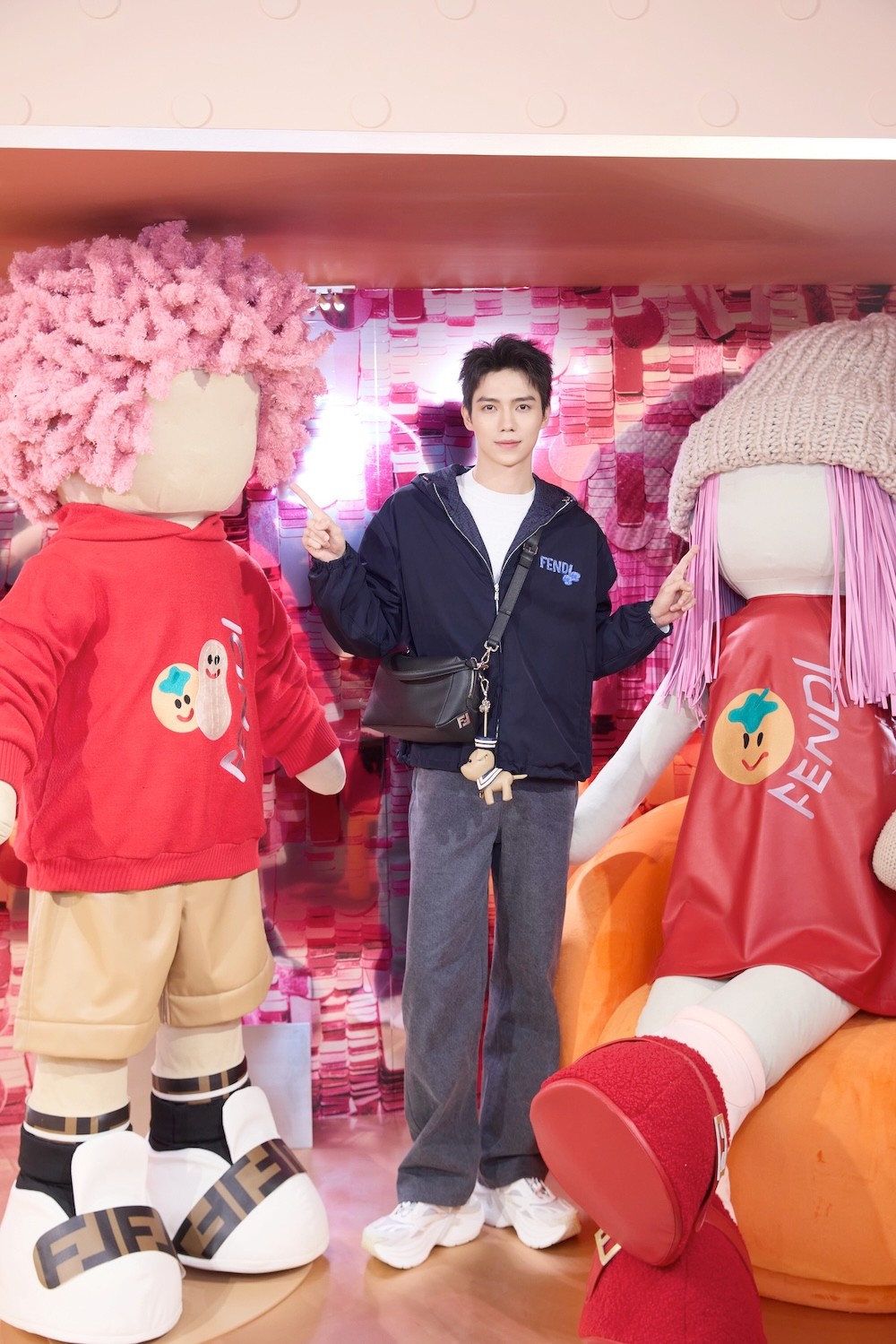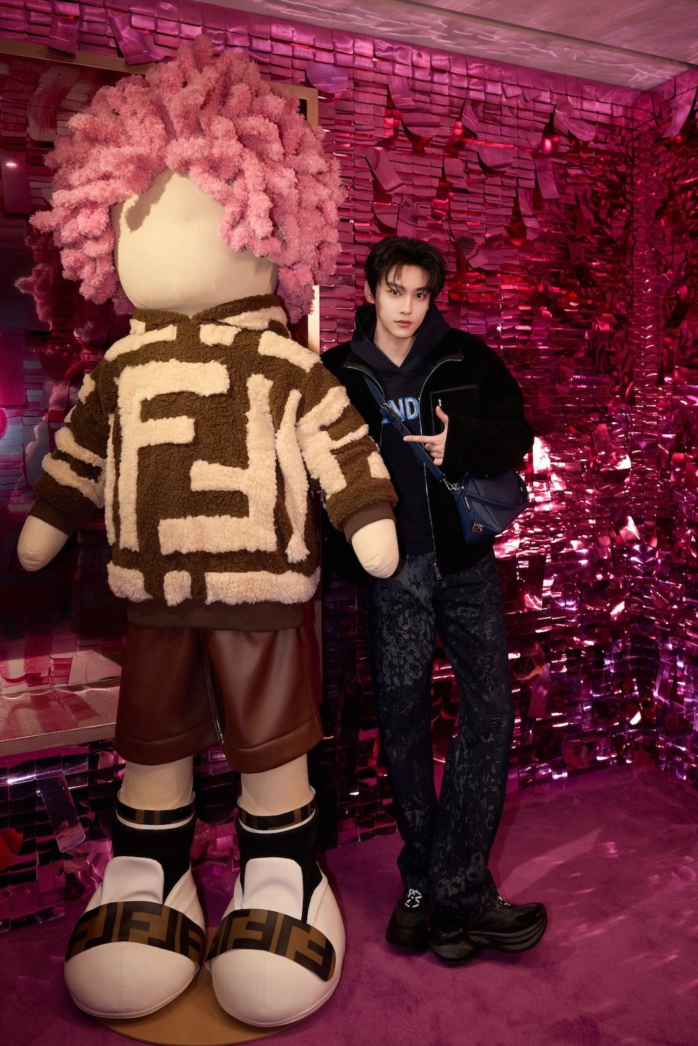 在关于内在之美的趣味探索中,粉色的建筑外立面缀以来自Peekaboo手袋的紫色亮片,与室内装饰风格遥相呼应。高达2.2米的2026春节限定系列BFF角色挂件静驻于橱窗之中,迎接着每一位来访者,并邀请他们步入2026春节系列宣传片温馨场景的室内空间——该短片正在此循环展映。FENDI BFF家族角色挂件的肖像装点着满布波点的粉色墙面,营造出温暖团圆的节日氛围。