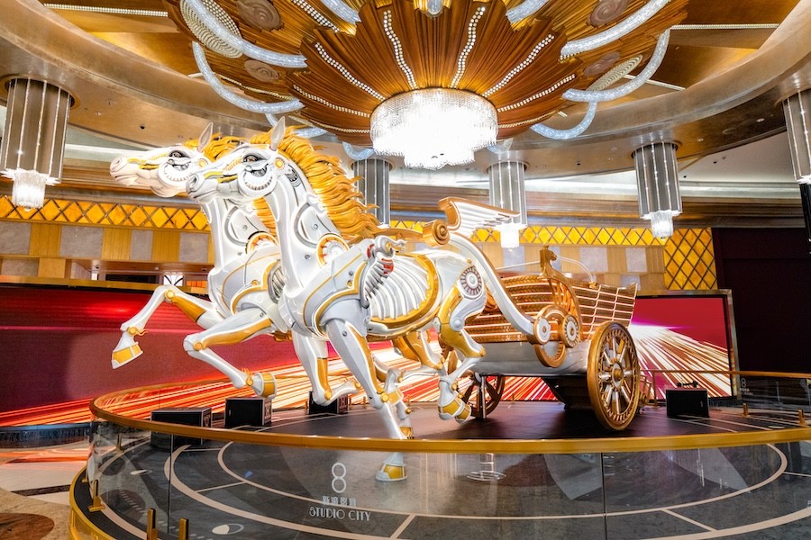 位于新濠影汇主入口高达3.5米的“骏马飞车”大型打卡装置率先成为全场焦点,设计灵感源自骏马奔腾的英姿,结合未来感造型与节庆元素,宾客可登上装置拍照留念,化身驰骋新岁的主角,留下极具气势与好运寓意的新春合影。新濠影汇更特别安排英姿焕发的“骏马骑士”现身,与宾客近距离互动合照,新一年一起骏马腾飞,幸福满载。