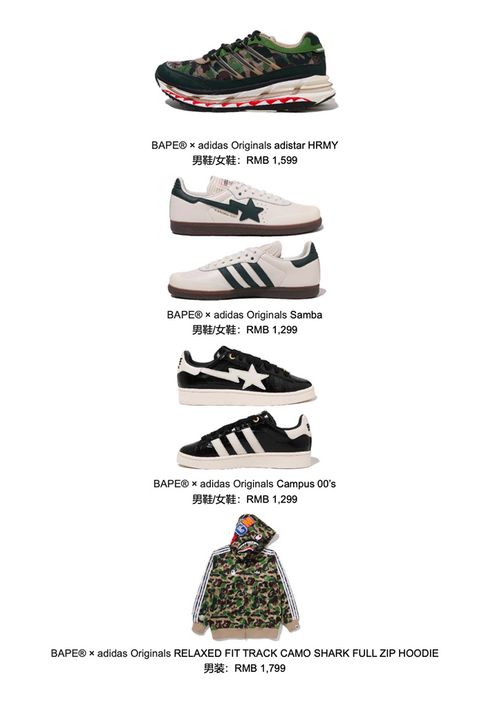 此次联名鞋款聚焦adistar HRMY BAPE®、Samba BAPE®和Campus 00’s BAPE®三款鞋型。主打跑鞋性能的adistar HRMY BAPE®覆以绿色ABC迷彩提炼视觉焦点,三条纹与BAPE STA™反光标识叠加点缀鞋侧,中底则置入彰显街头感的鲨鱼齿纹印花,为复古外观注入不羁锋芒。Samba BAPE®鞋款则延续上季首发的经典轮廓,注入简约清爽的绿茵场配色灵感。Campus 00’s BAPE®以黑色调勾勒隽永风格,两侧分别点缀白色BAPE STA™和三条纹标识,诠释低调而优雅的奢华格调。
