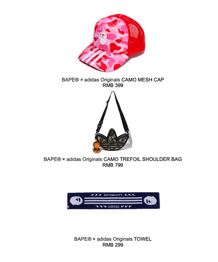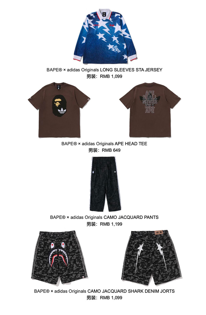 系列核心单品为球迷版长袖球衣,衣身将牛仔纹理印花与签名式 BAPE STA™标识叠加,辅以联名刺绣细节,传递经典复古美学。服装产品进一步延伸设计语言,无缝融合两大品牌的标志性元素,释出APE HEAD印花短袖、加持三叶草符号的绿色ABC迷彩鲨鱼帽衫,以及搭载鲨鱼图案的迷彩提花牛仔短裤、伞兵裤等时尚单品。配饰系列包括:以球迷围巾为灵感打造的毛巾、悬挂BABY MILO®公仔钥匙扣的三叶草造型挎包及粉色ABC迷彩卡车帽。