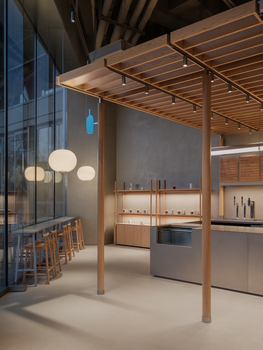 门店空间由如恩设计研究室(Neri & Hu)操刀,设计延续蓝瓶咖啡一贯的设计标准和美学,以克制且理性的空间语言,简洁的结构与充满细节的材质,呈现标志性的蓝瓶咖啡空间,将关注点回归到咖啡制作与日常交流本身。