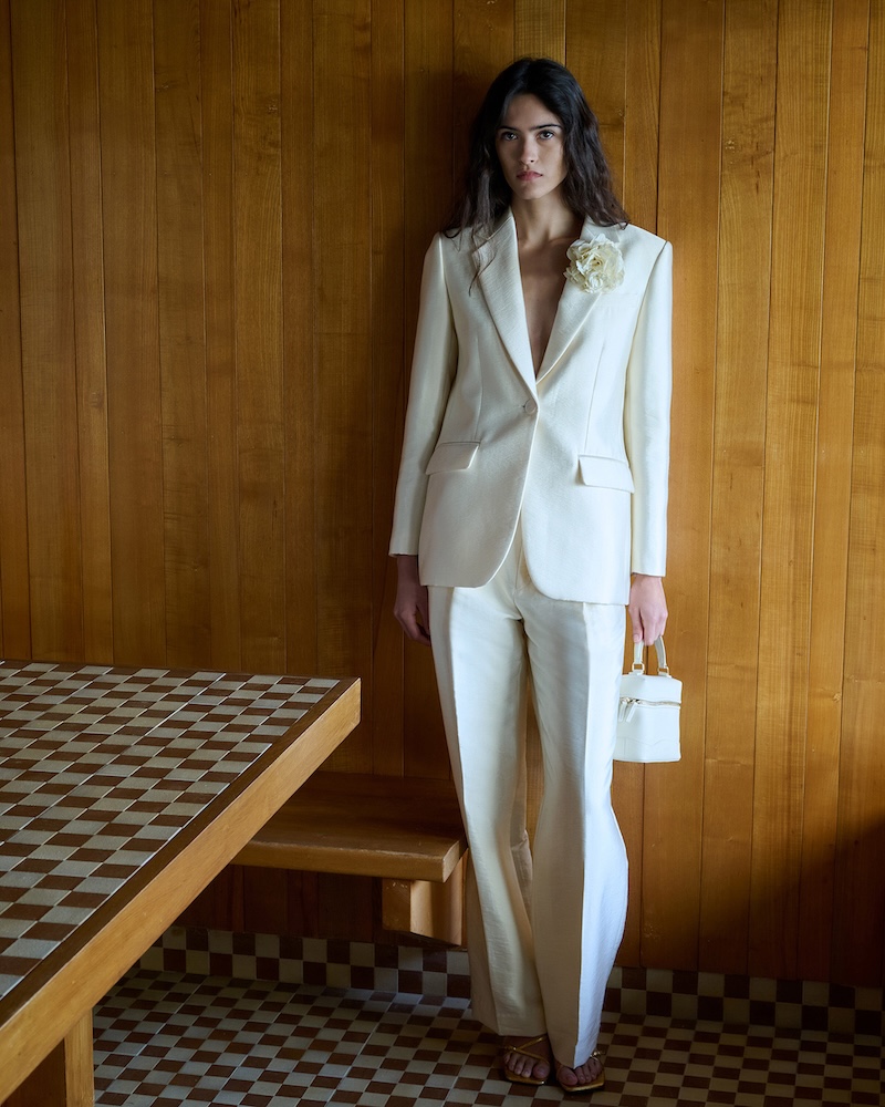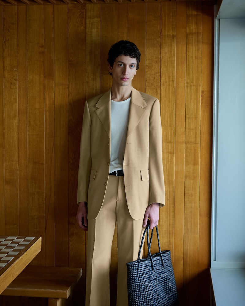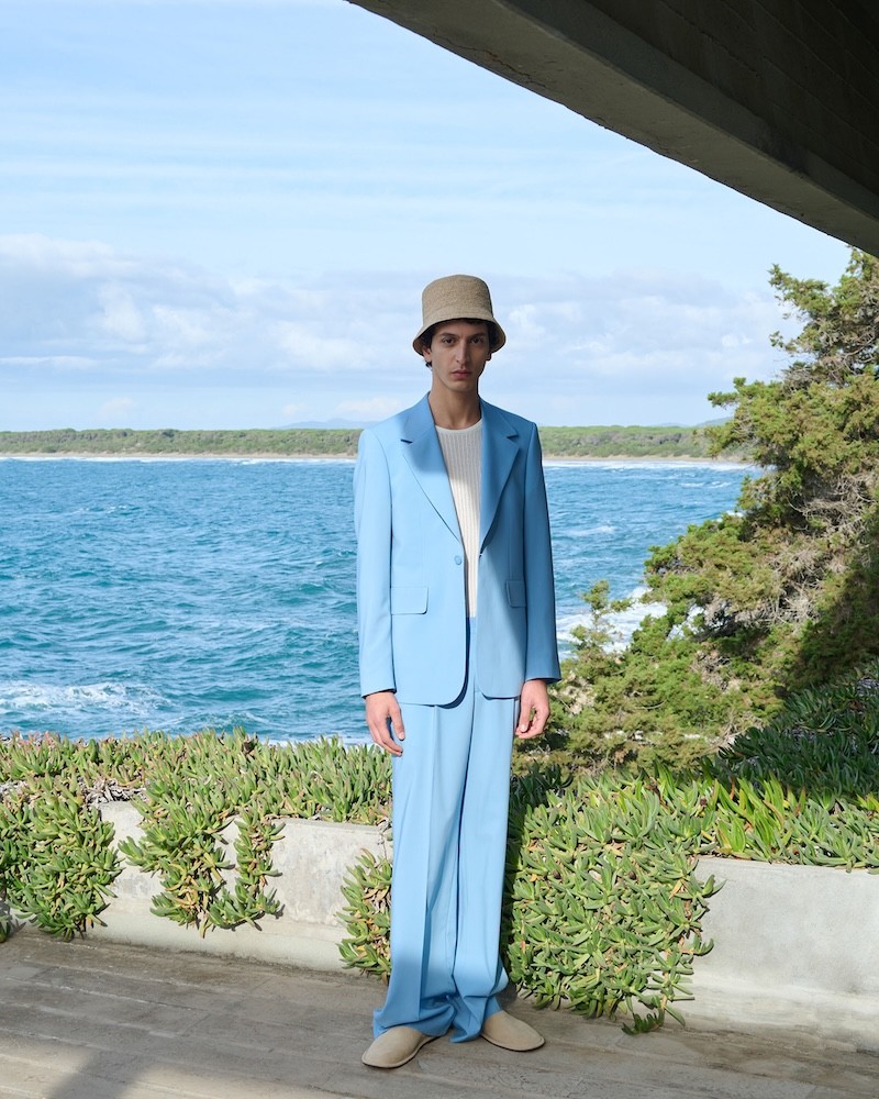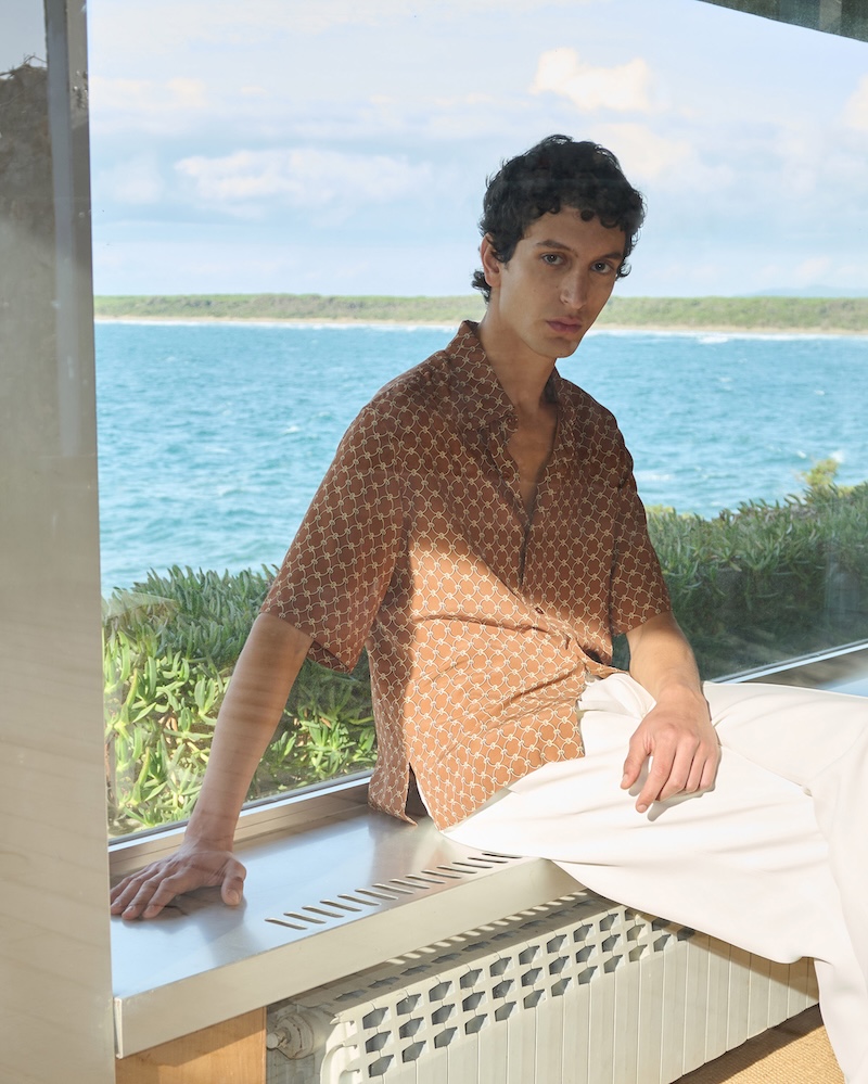 本系列男装以天空蓝与卡其色系单品诠释舒适自在的当代姿态。西装外套采用利落剪裁与松弛廓形诠释轻盈的早春气息;棕色衬衫的满印环形链状图案注入温和与复古质感;竖纹白色针织内搭与垂感长裤相互呼应,线条干净,比例舒展。西装与衬衫等男装标志性单品在度假氛围中被调至低调模式,安静日常却始终精致。