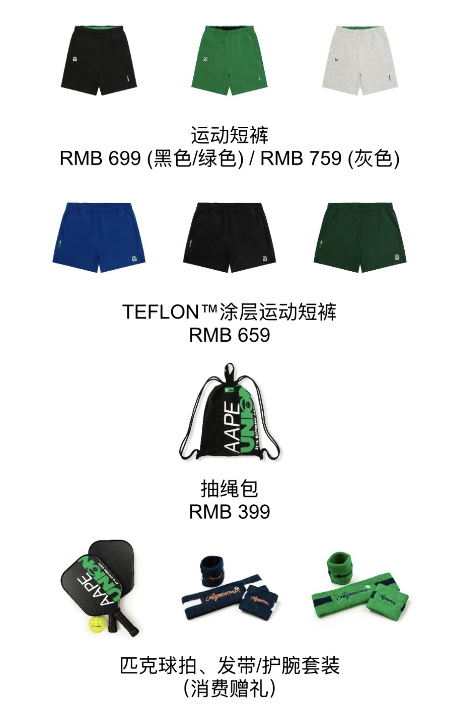 从运动装备到实用配饰,AAPE全新匹克球系列提供从球场到日常生活等多元场景的完整造型阵容,包括半拉链短身夹克、圆领卫衣、POLO衫、短袖T恤、运动裤装和抽绳袋等单品,完美兼顾实用主义机能与个性风格表达。系列同时推出匹克球拍、运动发带及护腕套装作为惊喜赠礼,助力时尚青年在球场挥拍时刻全方位领略匹克球运动的独特魅力。