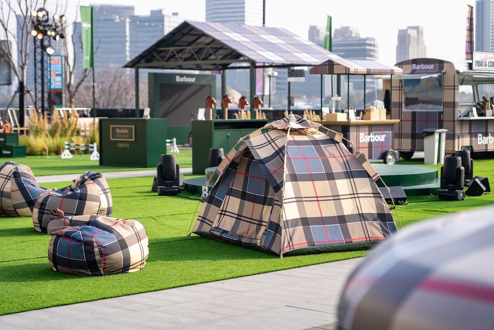 本次Barbour 春迹漫行主题快闪活动选址上海艺术地标西岸梦中心,整体空间设计以春季户外元素与Barbour 经典ICONS 系列夹克设计为灵感,摒弃传统厚重陈设,运用帐篷、豆袋沙发等轻便的户外装备取代传统的木质结构,搭配Barbour 春夏系列的轻盈色系,整体打造出通透、轻盈的自然气息。活动现场的标志性视觉元素取自Barbour Dress Tartan 格纹色系,格纹不再仅是图案,更升华为一种可感知的空间氛围。Barbour ICONS经典系列夹克作为贯穿全场的主角,巧妙地融入各个体验区域,生动诠释品牌理念与日常生活的完美契合。