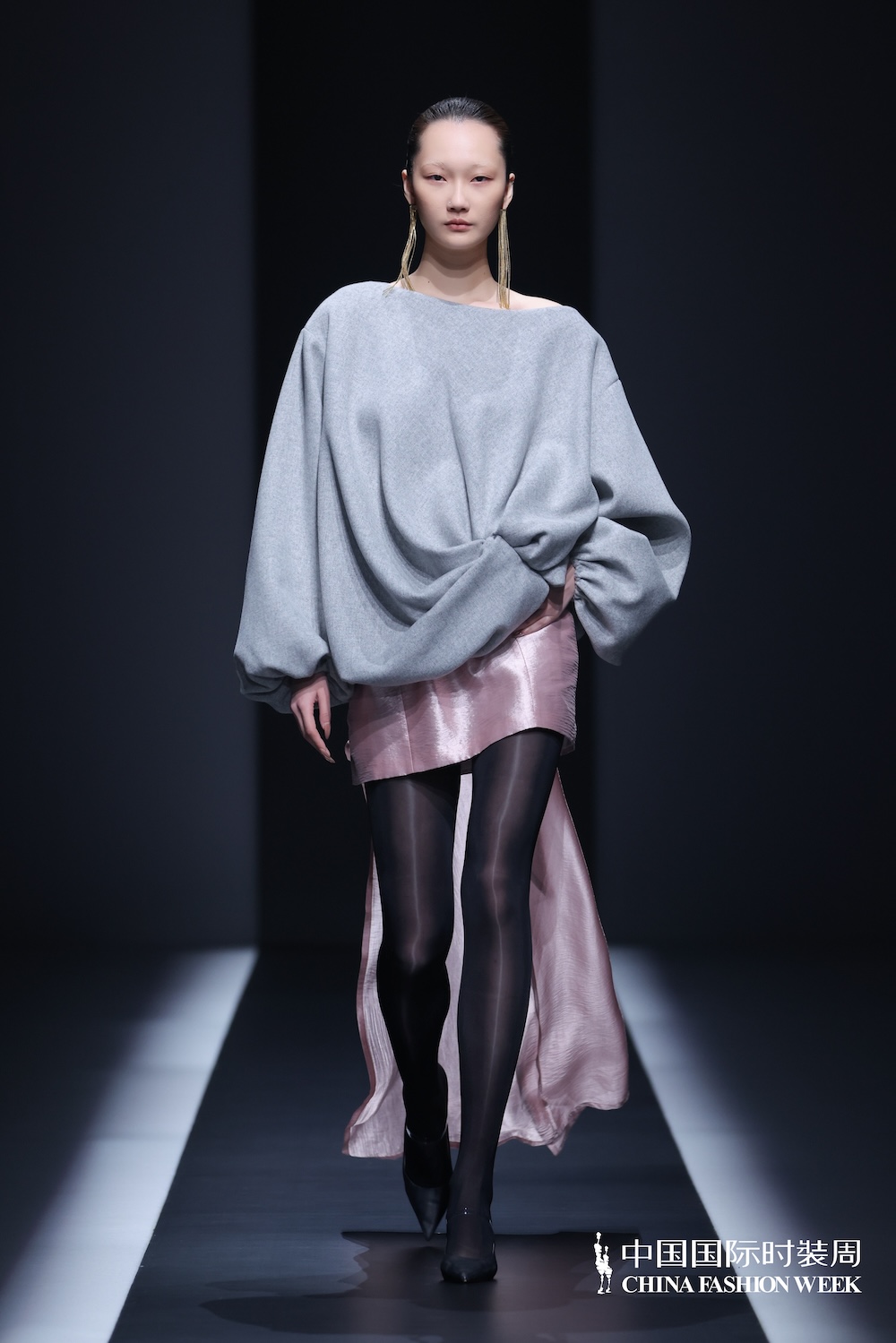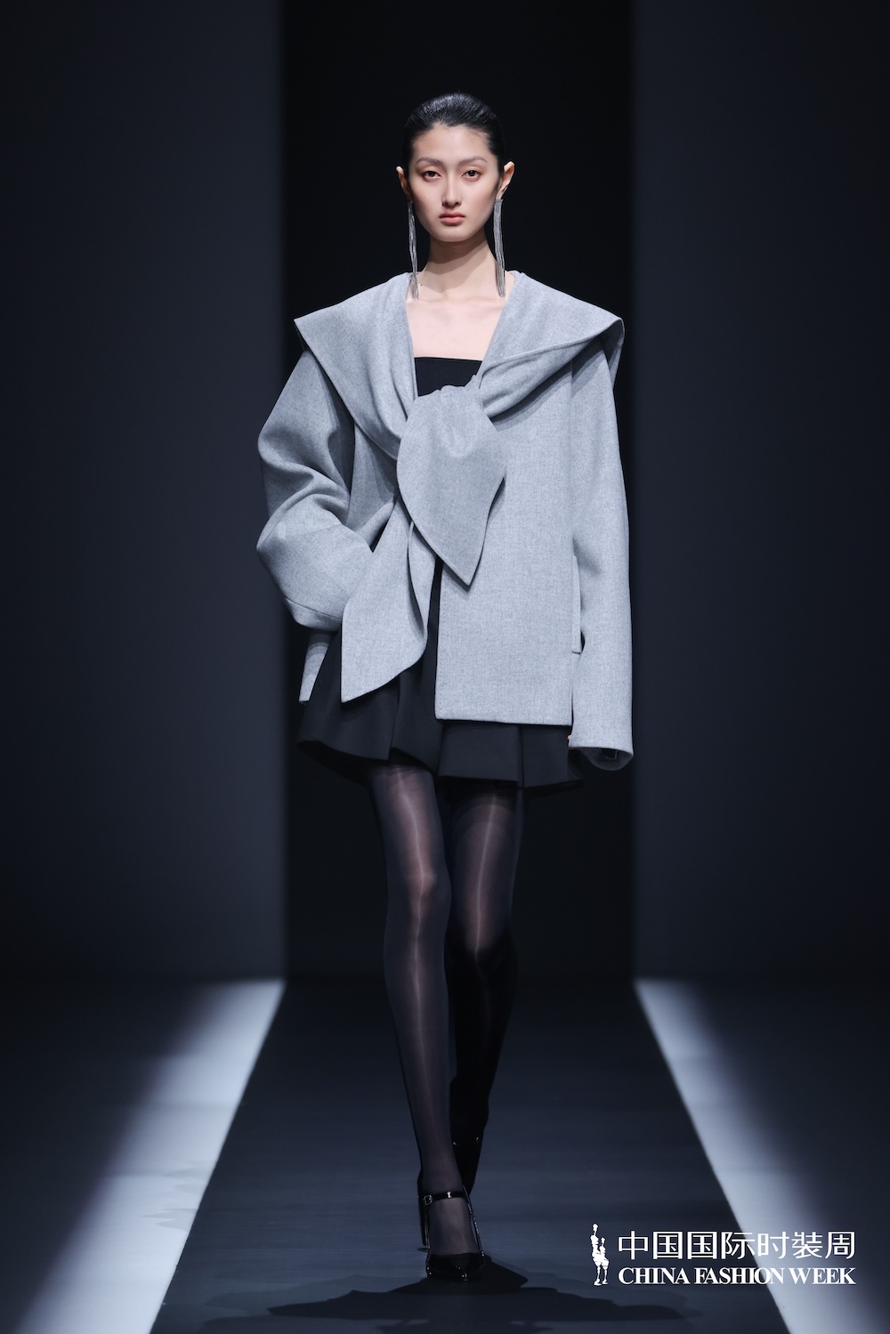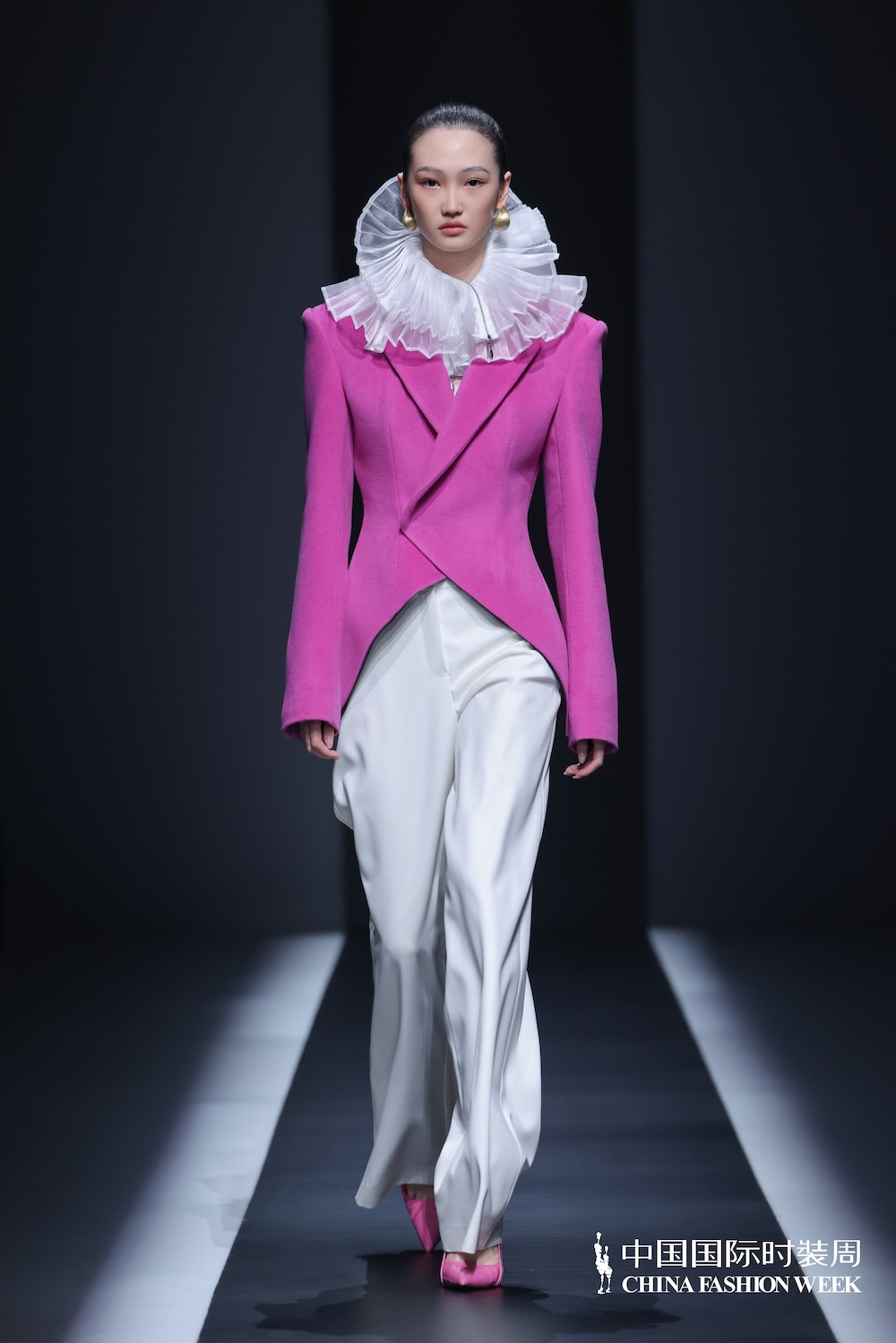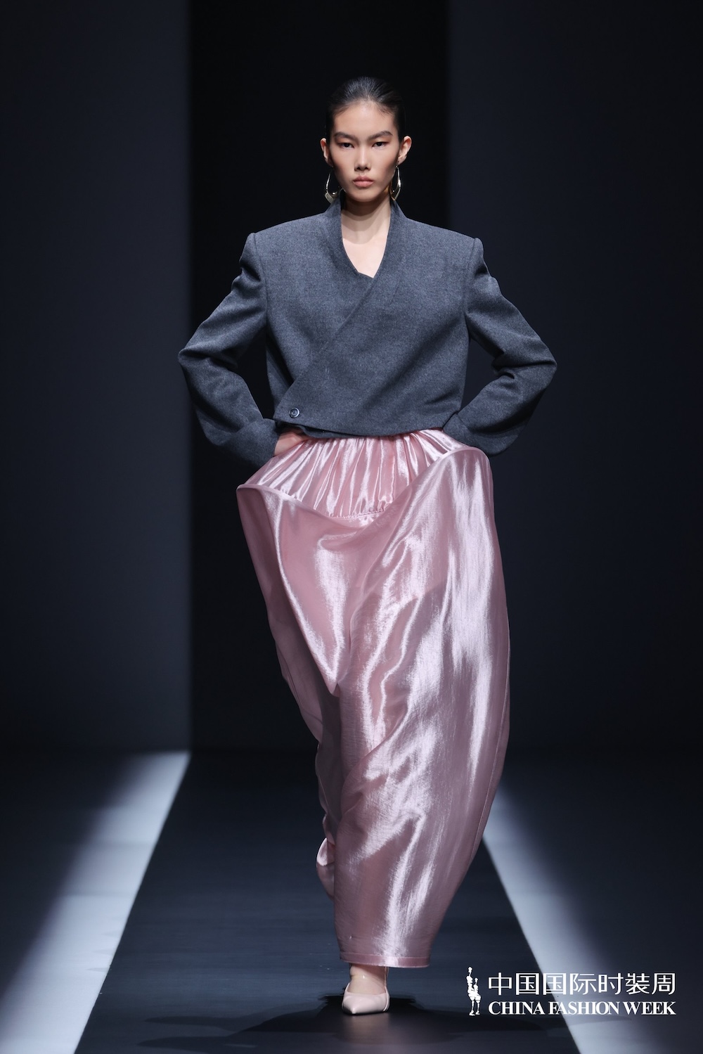 秀场之上,灯光渐亮、旋律奏响,模特身着玫粉色长款大衣,搭配压褶工艺打造的白色花瓣裙优雅登场,将“我”对世界最初的懵懂感知,悄然藏于衣物肌理之中;随着旋律鼓点逐渐加重,象征着成长历程的推进,服装色彩从明艳热烈的玫粉,渐变为低调内敛的炭灰、中灰与浅灰蓝。颈部缠绕的线条、肩部利落的轮廓、胯部扩张的结构、衣身斜向交错的剪裁,生动勾勒出成长路上和谐与冲突共生的状态;最终,以克制沉稳的酒红色调、舒展自在的服装造型,呈现出当下“我”对世界的成熟理解与全新感知。此外,设计师宋双以独特的设计语言,重新演绎16世纪拉夫领与中世纪欧洲裙撑经典元素,融合建筑美学结构特点,打造出极具空气感的造型,成为秀场一大亮点。