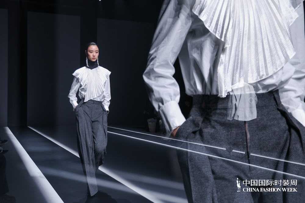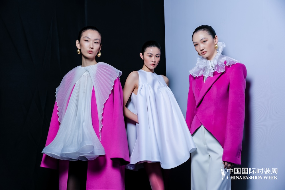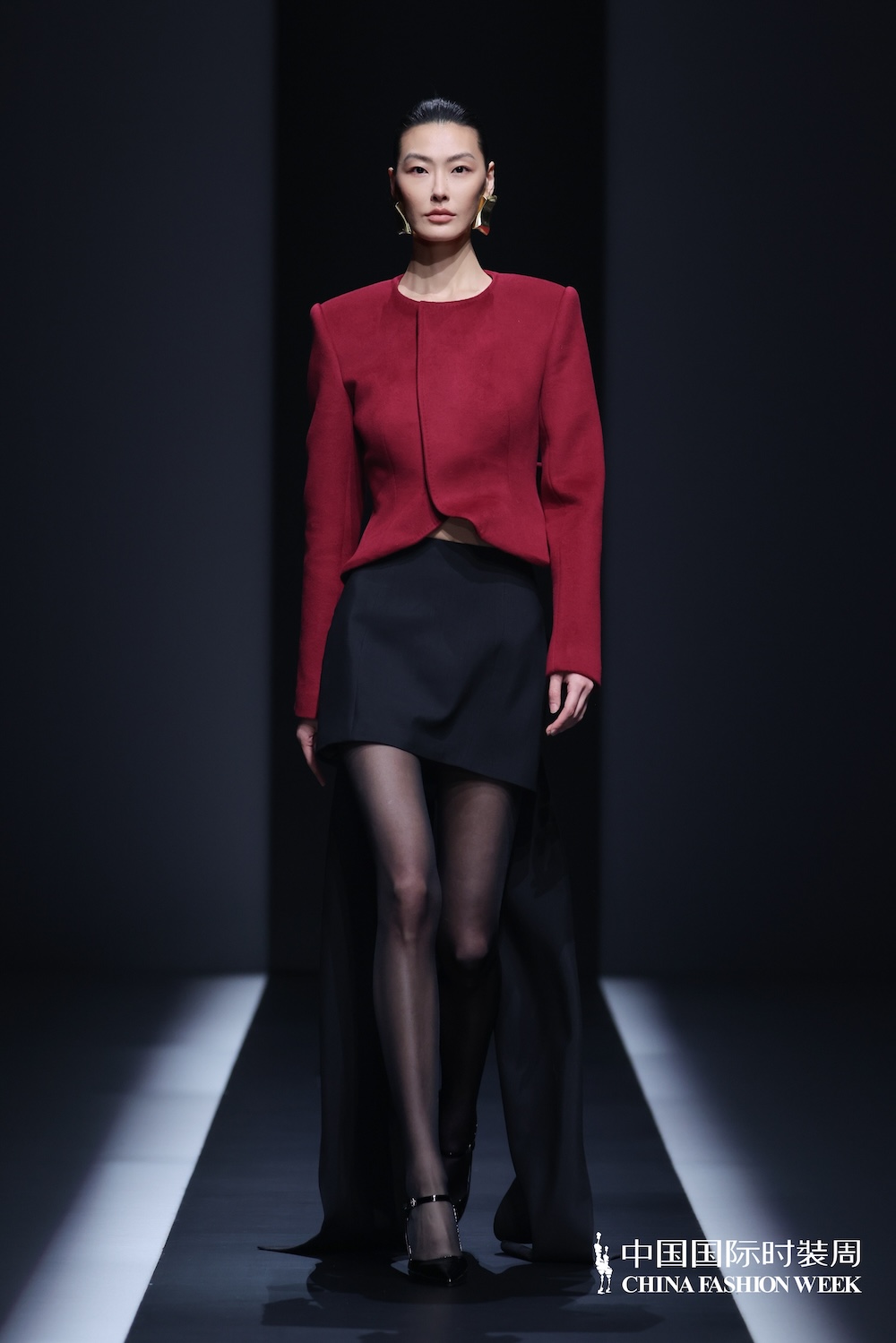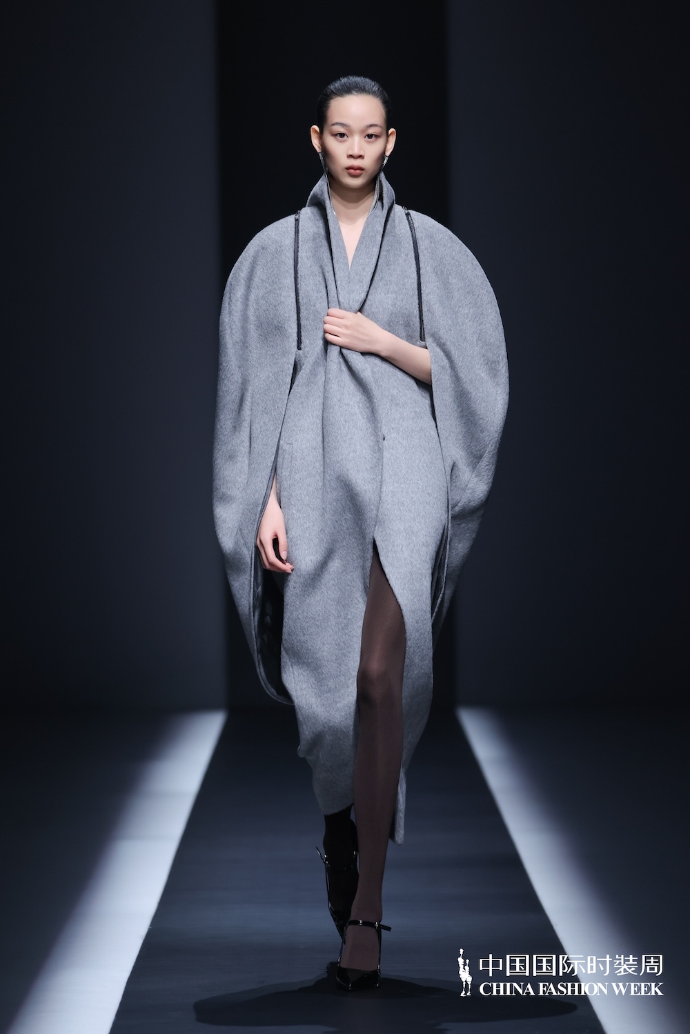 秀场之上,灯光渐亮、旋律奏响,模特身着玫粉色长款大衣,搭配压褶工艺打造的白色花瓣裙优雅登场,将“我”对世界最初的懵懂感知,悄然藏于衣物肌理之中;随着旋律鼓点逐渐加重,象征着成长历程的推进,服装色彩从明艳热烈的玫粉,渐变为低调内敛的炭灰、中灰与浅灰蓝。颈部缠绕的线条、肩部利落的轮廓、胯部扩张的结构、衣身斜向交错的剪裁,生动勾勒出成长路上和谐与冲突共生的状态;最终,以克制沉稳的酒红色调、舒展自在的服装造型,呈现出当下“我”对世界的成熟理解与全新感知。此外,设计师宋双以独特的设计语言,重新演绎16世纪拉夫领与中世纪欧洲裙撑经典元素,融合建筑美学结构特点,打造出极具空气感的造型,成为秀场一大亮点。