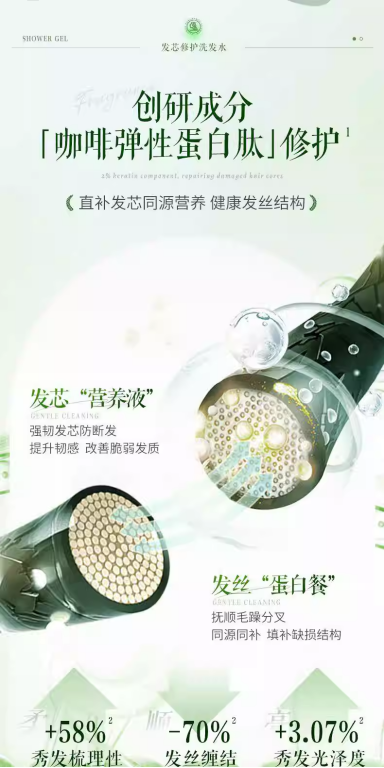 核心控油体系采用深海海盐、茶叶提取物、无患子果、母菊等成分,帮助清洁头皮多余油脂,改善发根容易扁塌的问题;修护方向则围绕品牌自研护理体系展开,搭配咖啡弹性蛋白肽、弹性蛋白乳液精华等成分,帮助改善发丝梳理性、干涩感和缠结感,让头发在清洁之后不至于过于干涩。整体更适合“头皮容易油、发丝又不想太干”的人群。